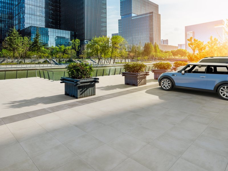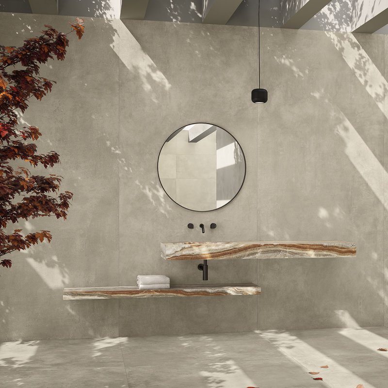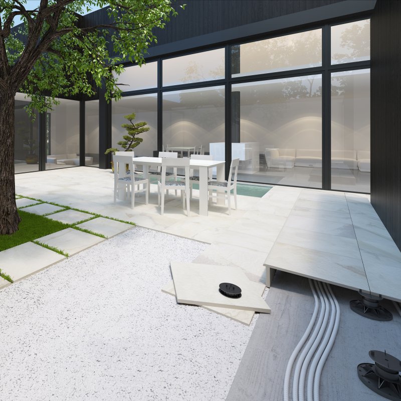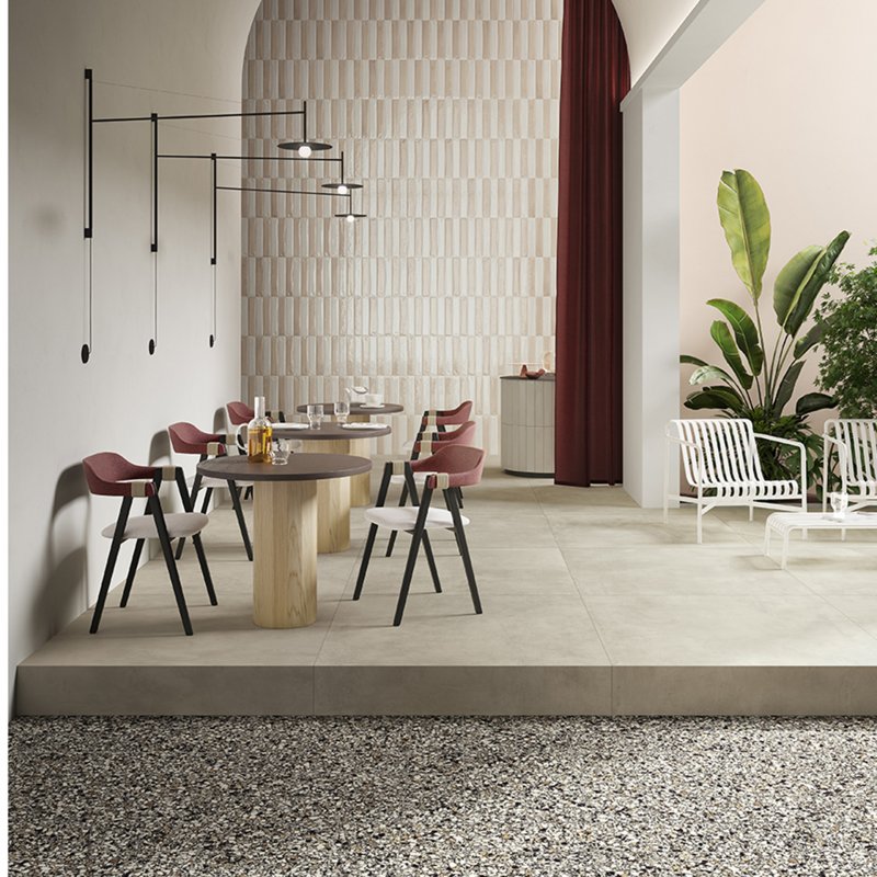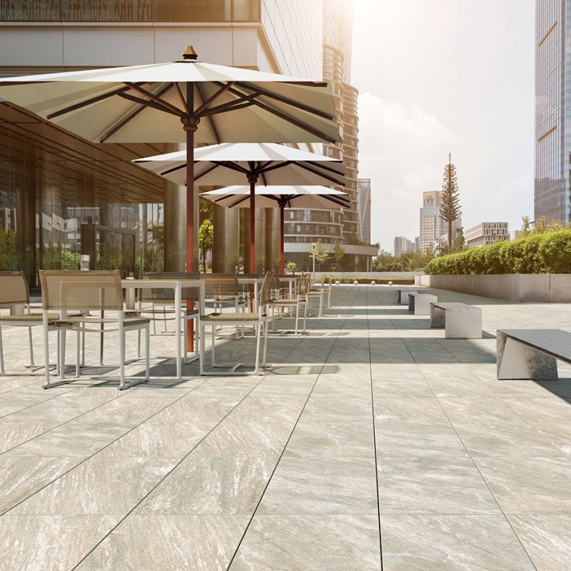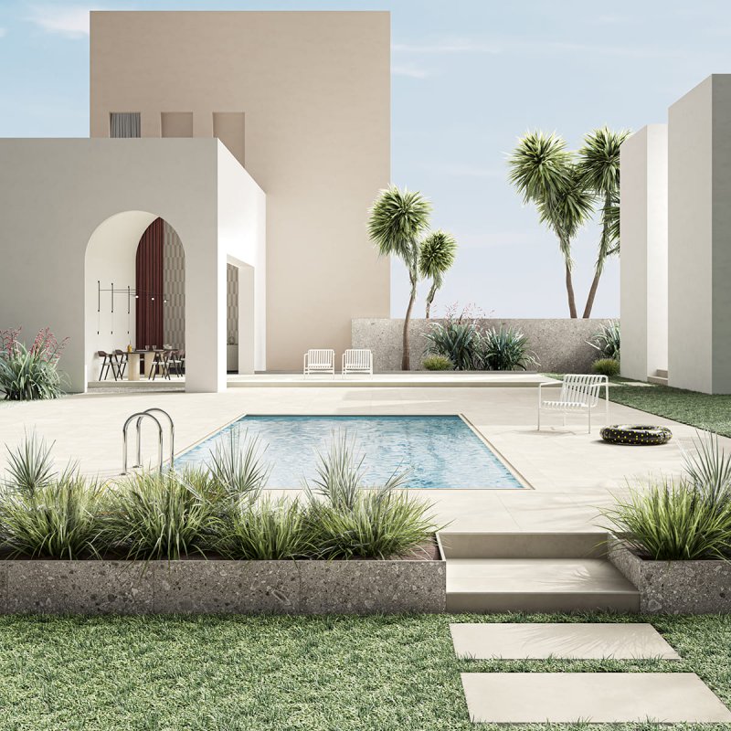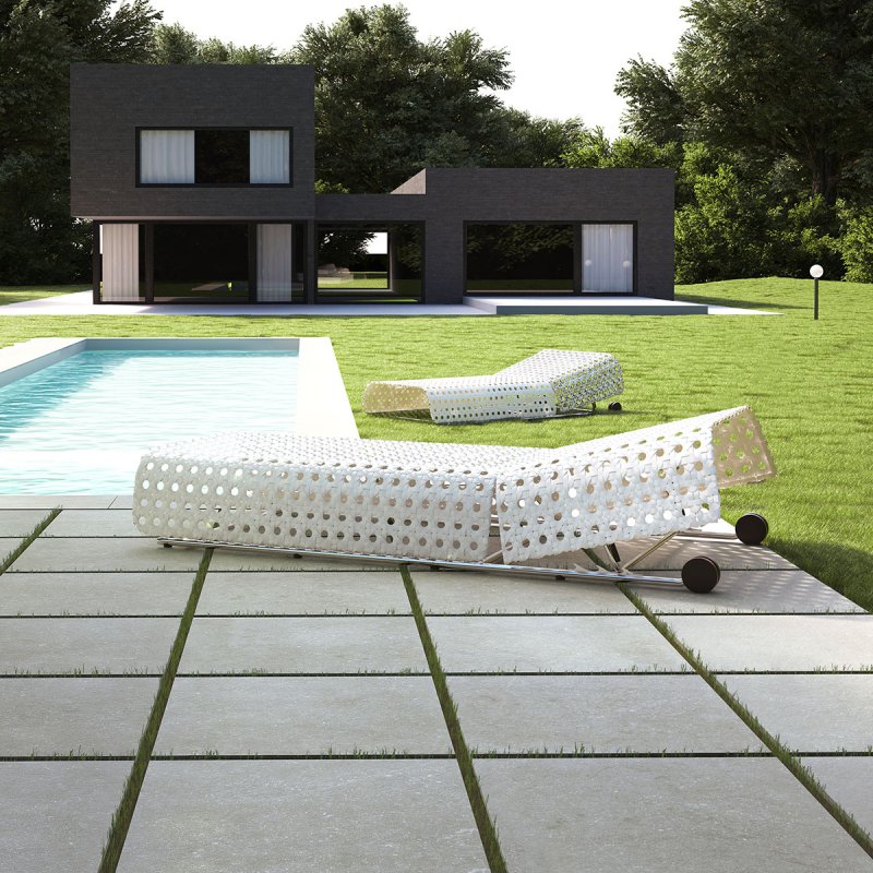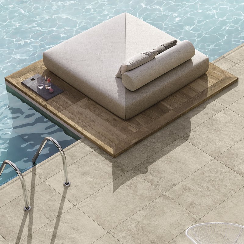 Quant aux sols extérieurs, avec l´application d´émail antidérapant on peut habiller toute la zone de notre piscine ou de notre terrasse. Si quelque série pierre est disponible en 20 mm, on pourra poser ce matériau dans des zones de grand passage ou des garages.